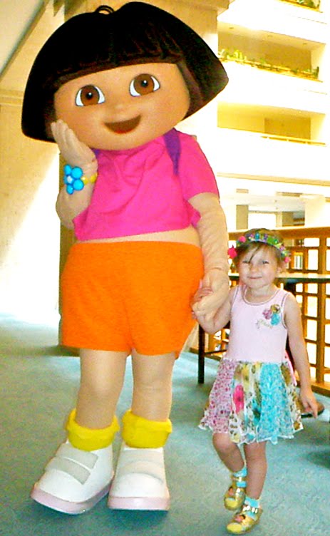Upon arrival we were greeted by Spongebob Squarepants and Dora the Explorer. This was the perfect start to our fun-filled weekend. Click over to view a short video of my daughter when she first saw Dora. After spending some time with Dora we decided to hit the pool for some sun and relaxation. My husband and daughter enjoyed swimming and playing on the sandy beach while mommy enjoyed a (virgin) margarita by the pool. The resort grounds are truly beautiful with fire pits, palm trees and a poolside bar. It was quite relaxing!