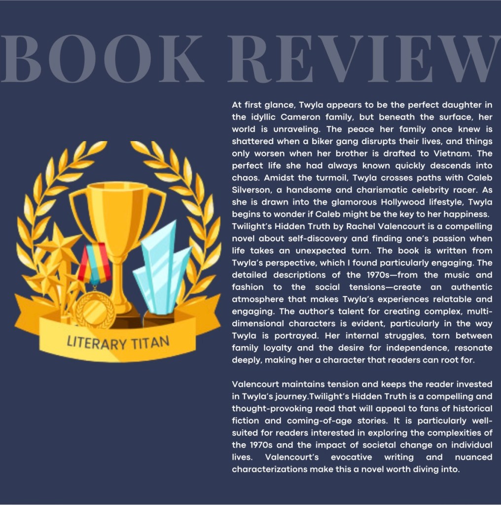 Her second novel, Twilight’s Hidden Truth, continued her winning streak by earning the Literary Titan Award and the BookFest Award for Coming-of-Age Fiction, while also being recognized as a Finalist in the IAN Book of the Year Awards for Historical Fiction.