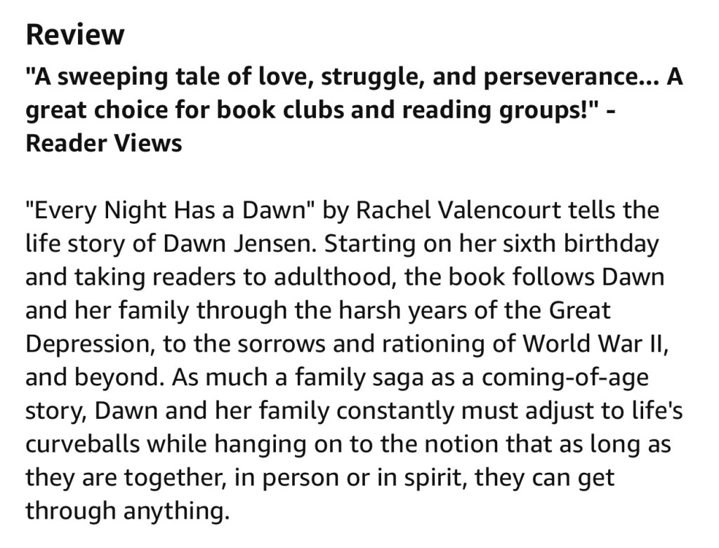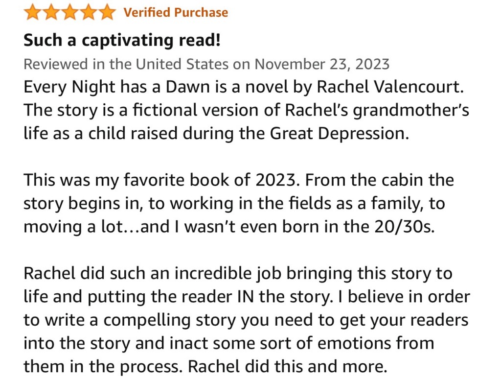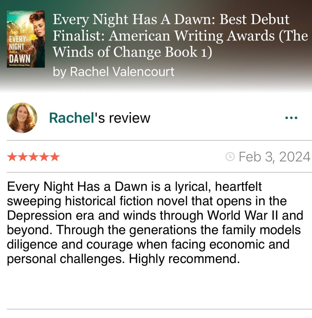 “Every Night Has A Dawn” drew me into its world and refused to let go. This remarkable debut novel immersed me into the midst of the Great Depression, but it’s so much more than a historical tale—it’s a heartfelt exploration of family, resilience, and the evolving role of women in a changing world.